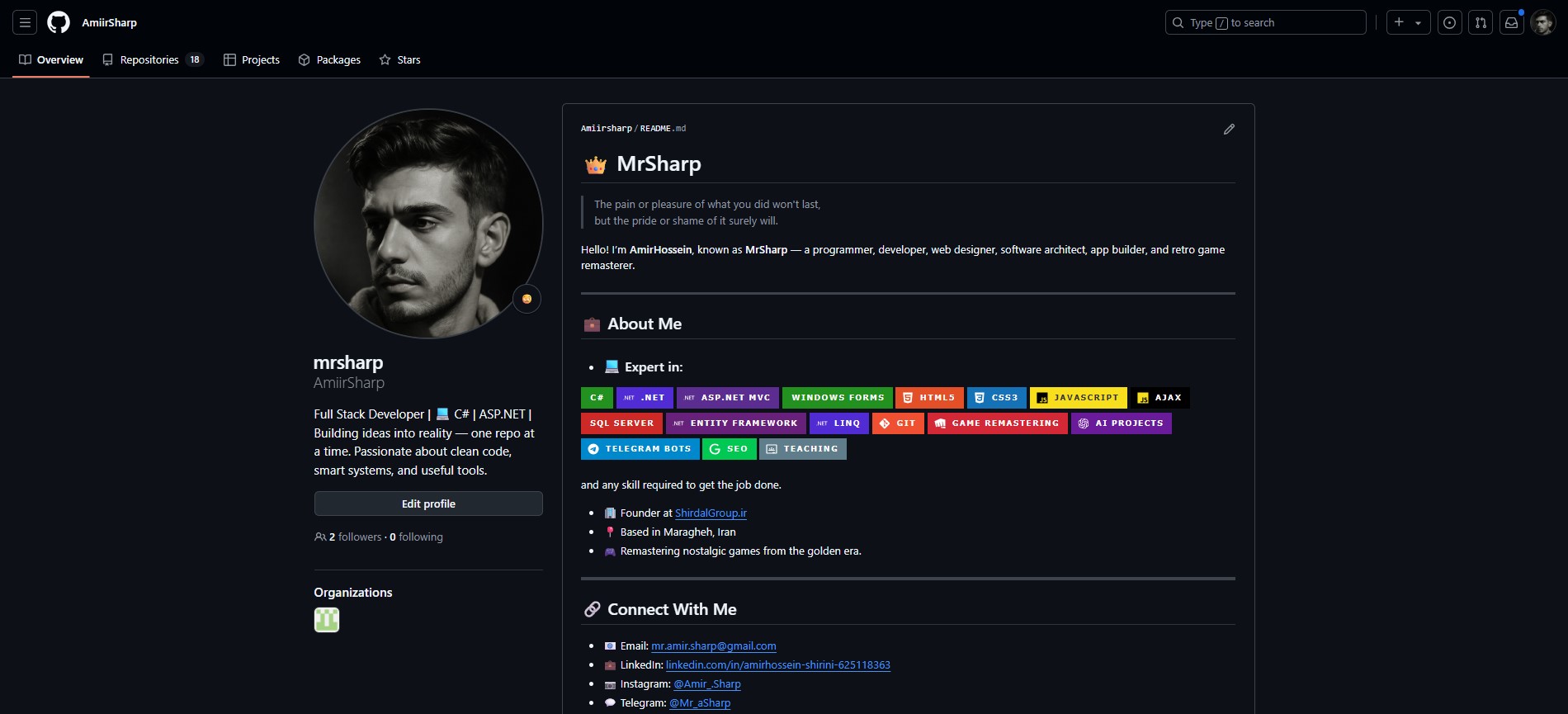 در نتیجه، پروفایل شما اکنون به صورت کامل و حرفهای آماده است و میتواند به عنوان یک نمایه معتبر در گیتهاب برای نمایش پروژهها، مهارتها و همکاریهای حرفهای شما مورد استفاده قرار گیرد. این پروفایل، به طور کامل و دقیق، نمایانگر تخصص و تعهد شما به دنیای برنامهنویسی و تکنولوژی است. شما اکنون یک پروفایل گیتهاب حرفهای دارید که نه تنها شما را از دیگران متمایز میکند، بلکه در دنیای رقابتی توسعه نرمافزار نیز شما را قابلاعتماد و برجسته میسازد.